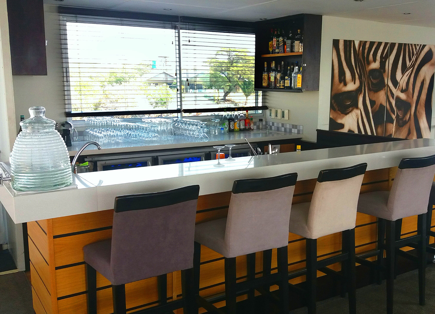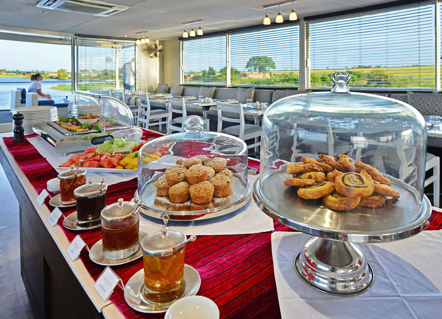 Due to her small size, Zambezi Queen only has one dining venue that also serves as a lounge and bar. Here, you can experience exquisite African-inspired cuisine with three large windows that offer a breathtaking view of the passing landscape.