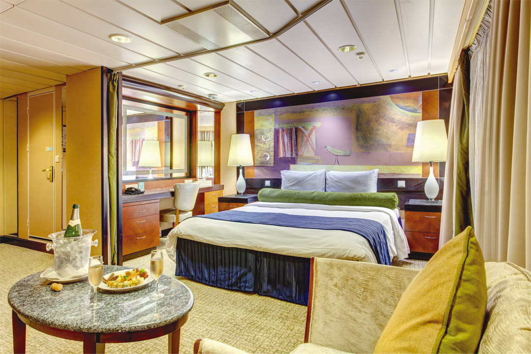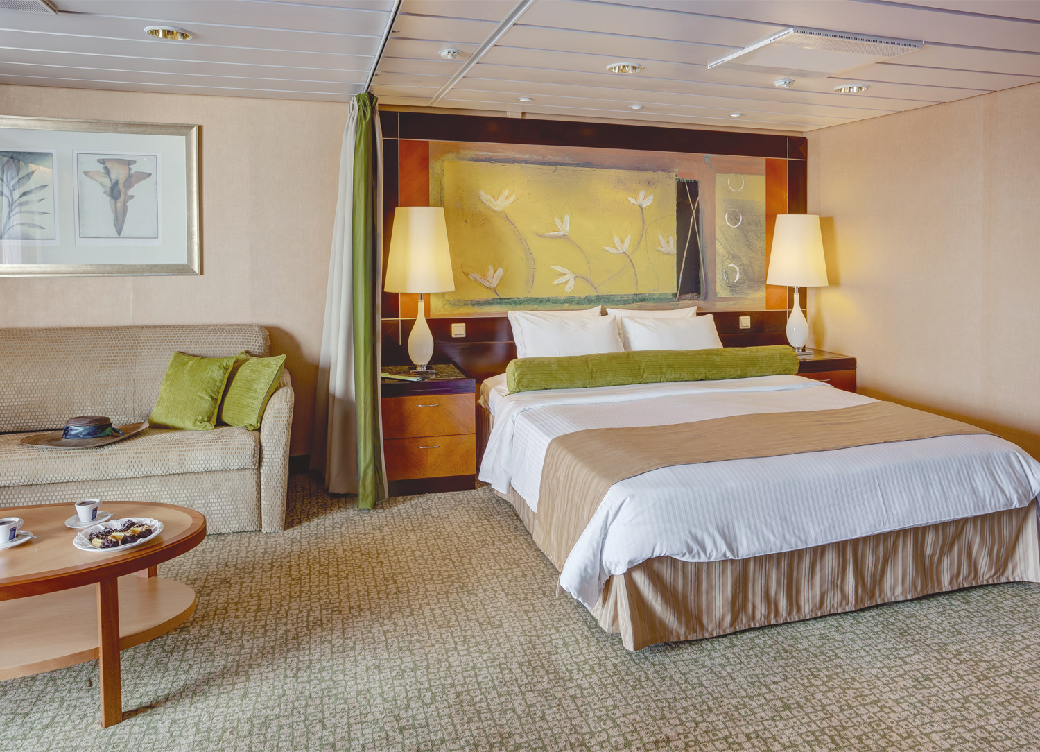 Suites and deluxe cabins are located on Deck 10, consist of the best spaces on the ship and can accommodate 1 to 4 guests. Each suite or deluxe cabin shares the standard features of Inside cabins and also includes a private balcony and sofa-bed so you can relax inside or outside, however you want. Royal suites and suites with balconies come with a minibar so you never have to travel far to grab a drink. Most suites and deluxe cabins provide quick access to the gym, theater and spa.