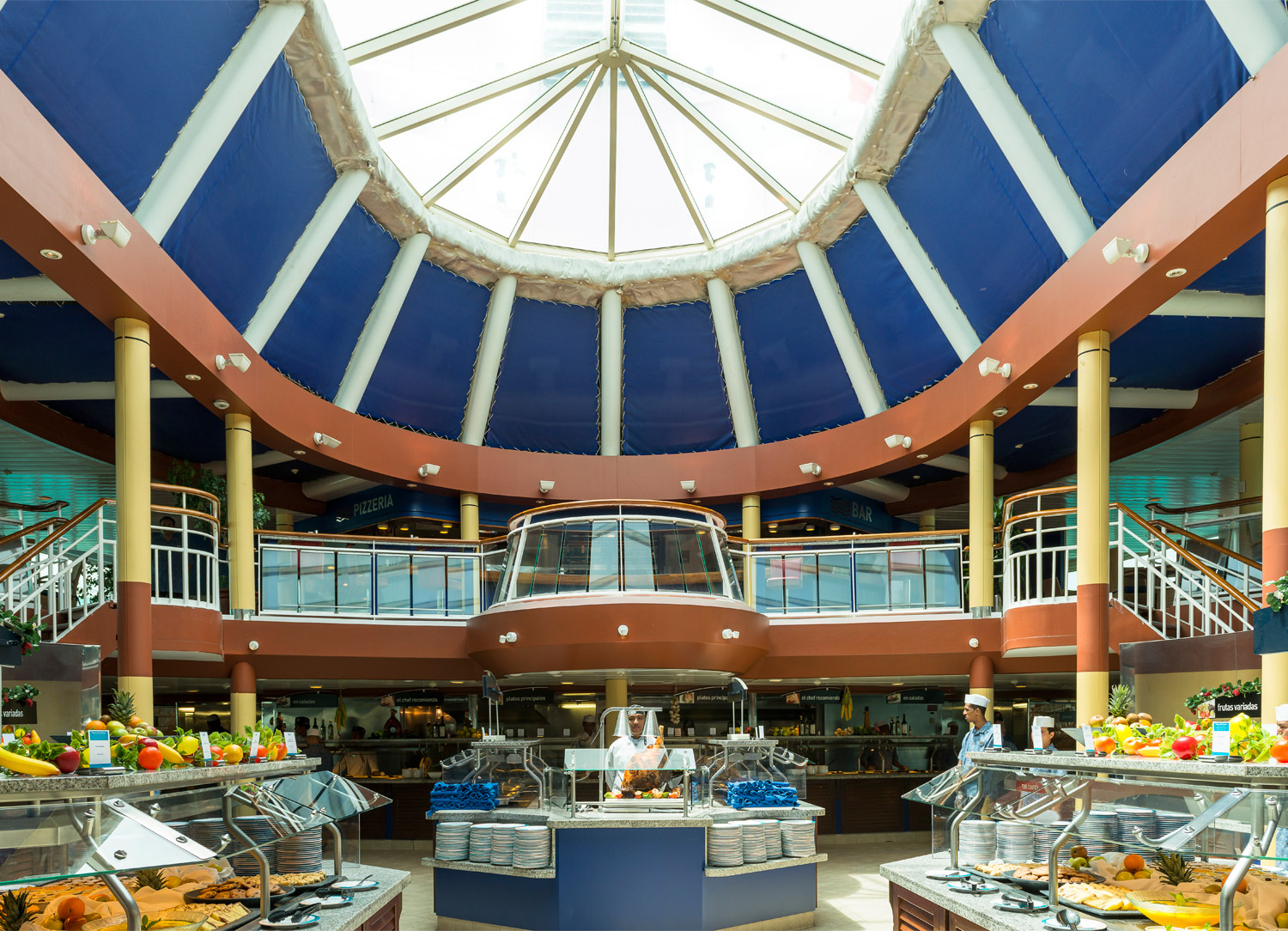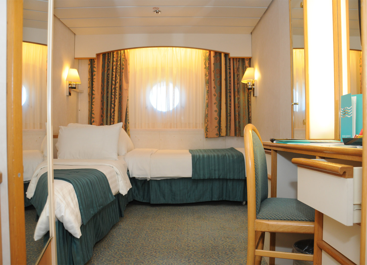 Inside cabins are located on Decks 2 to 7 and can accommodate 1 to 4 guests. Each one includes a convertible double bed, bathroom, dressing table, TV, safety deposit box and hair dryer and provides quick access to the onboard restaurants and entertainment facilities. Outside cabins are located on Decks 2 to 8 and have a little more space than Inside cabins although they are decorated similarly. Each outside cabin comes with a window and some are interconnected. Outside cabins include the same standard features as Inside cabins and, depending on which specific type of Outside cabin you reserve, provide quick access to hot areas of the ship including the showroom, casino, shops, restaurants, internet zone, reception and tours office and salon.