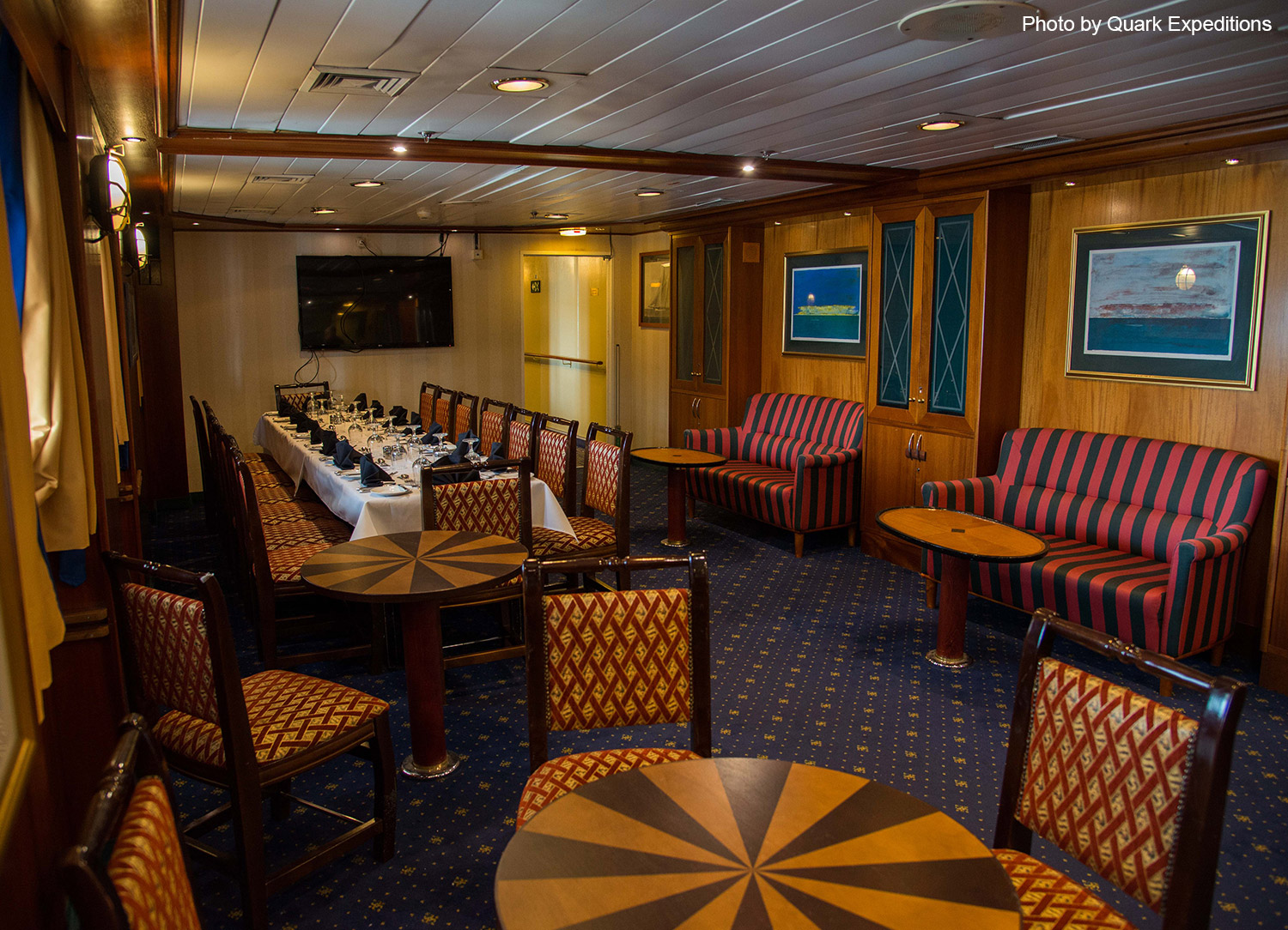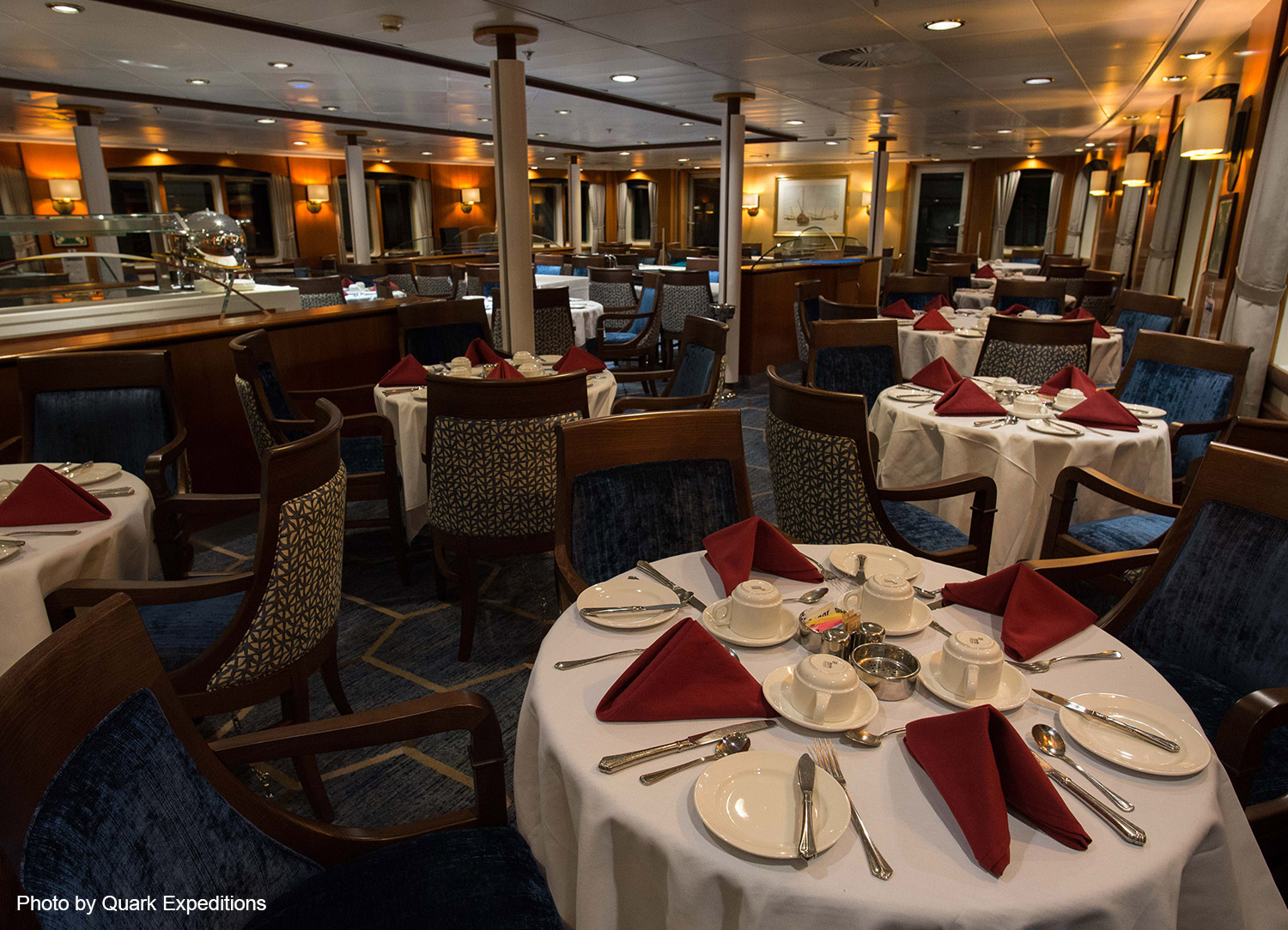 Guests are ensured savory cuisine from Quark Expeditions' top-notch international chefs on Ocean Adventurer. All meals, which are included in your cruise fare, are inside the exquisite open-seating Dining Room. There's plenty of variety with a menu, including vegetarian options, that changes every day. Plus, guests looking for a more intimate meal can book a table at the private Clipper Club.