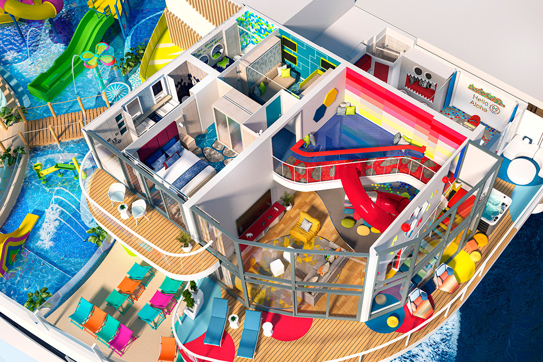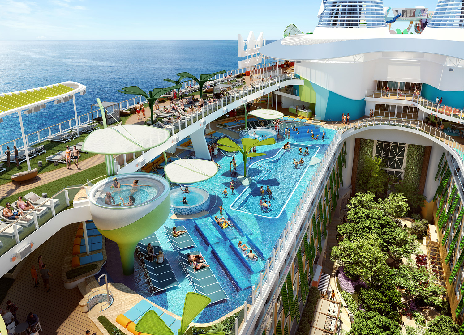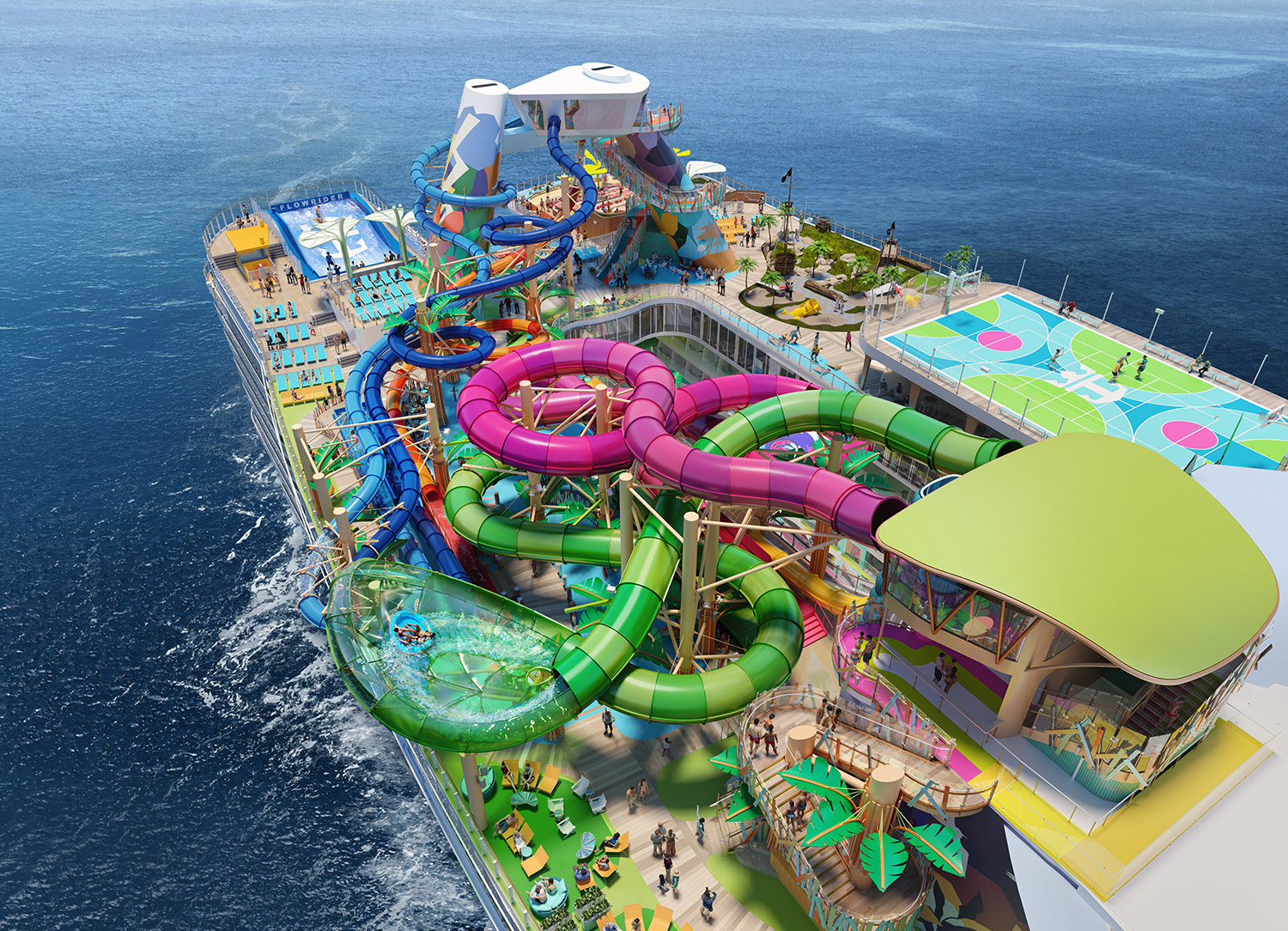 Packed with chills, thrills, and wows, the new Royal Caribbean cruise ship comes with nine pools, new waterslides, and the first funnel raft slide at sea!