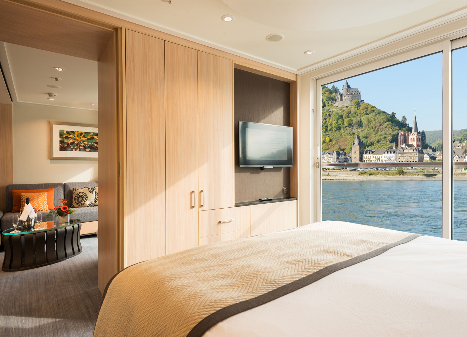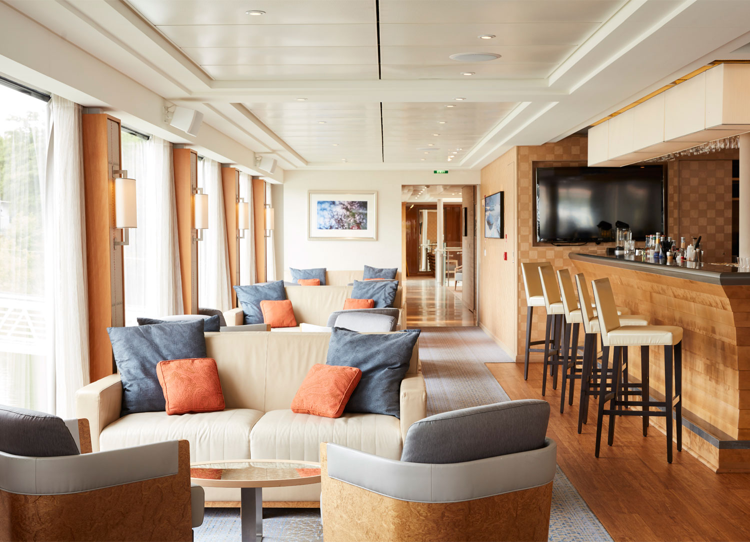 The Aquavit Terrace is a beautiful public area offering breathtaking views of the passing scenery to Viking Hermod cruise guests. This is a wonderful place to spend time when you’re not off exploring Europe. With plenty of comfortable furnishings as well as tables and chairs, this terrace is perfect for enjoying a morning cup of coffee, an afternoon cocktail, or a casual dinner as the warm pink sun sets behind you. If the pianist is playing in the lounge, you may just be able to hear his faint tunes from this area, as well, adding a very nice touch to the ambiance.
